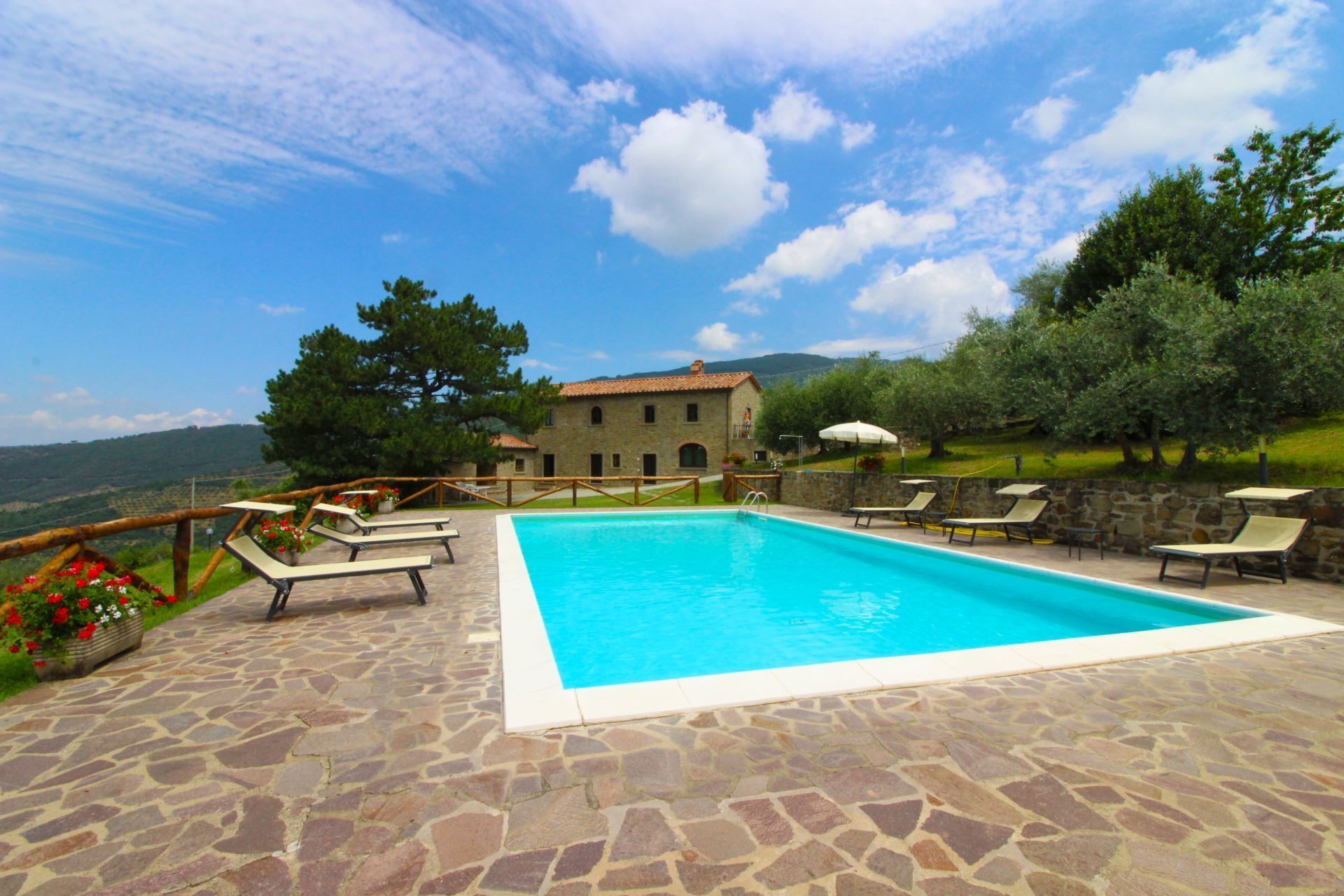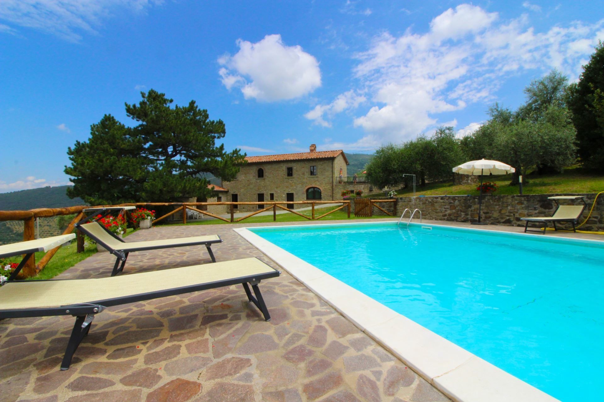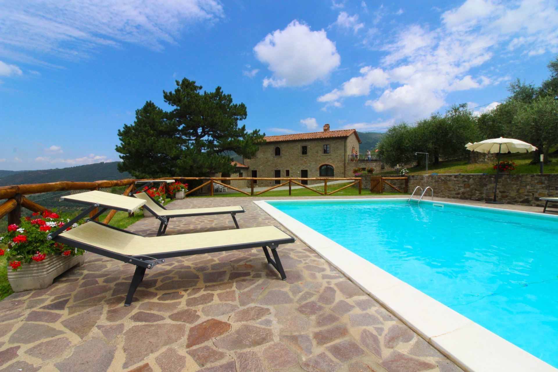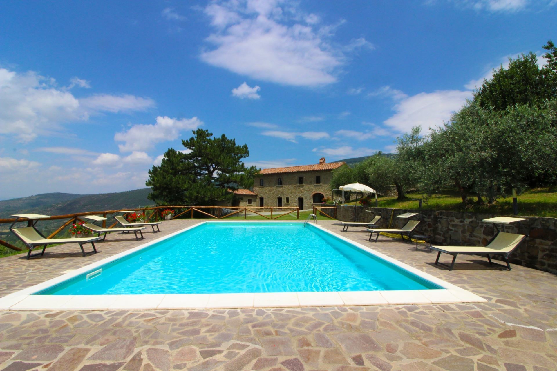 The villa, the swimming pool and the outdoor spaces. The holiday villa is situated on a hilltop, amidst terraced olive groves that stretch down into the valley. In front of the villa there is a large natural terrace, surrounded by olive trees and equipped with garden furniture, barbecue, wood-burning oven and a 6 x 12 m swimming pool (depth 1,20-1,50m). The villa is furnished in simple and tasteful Tuscan style.