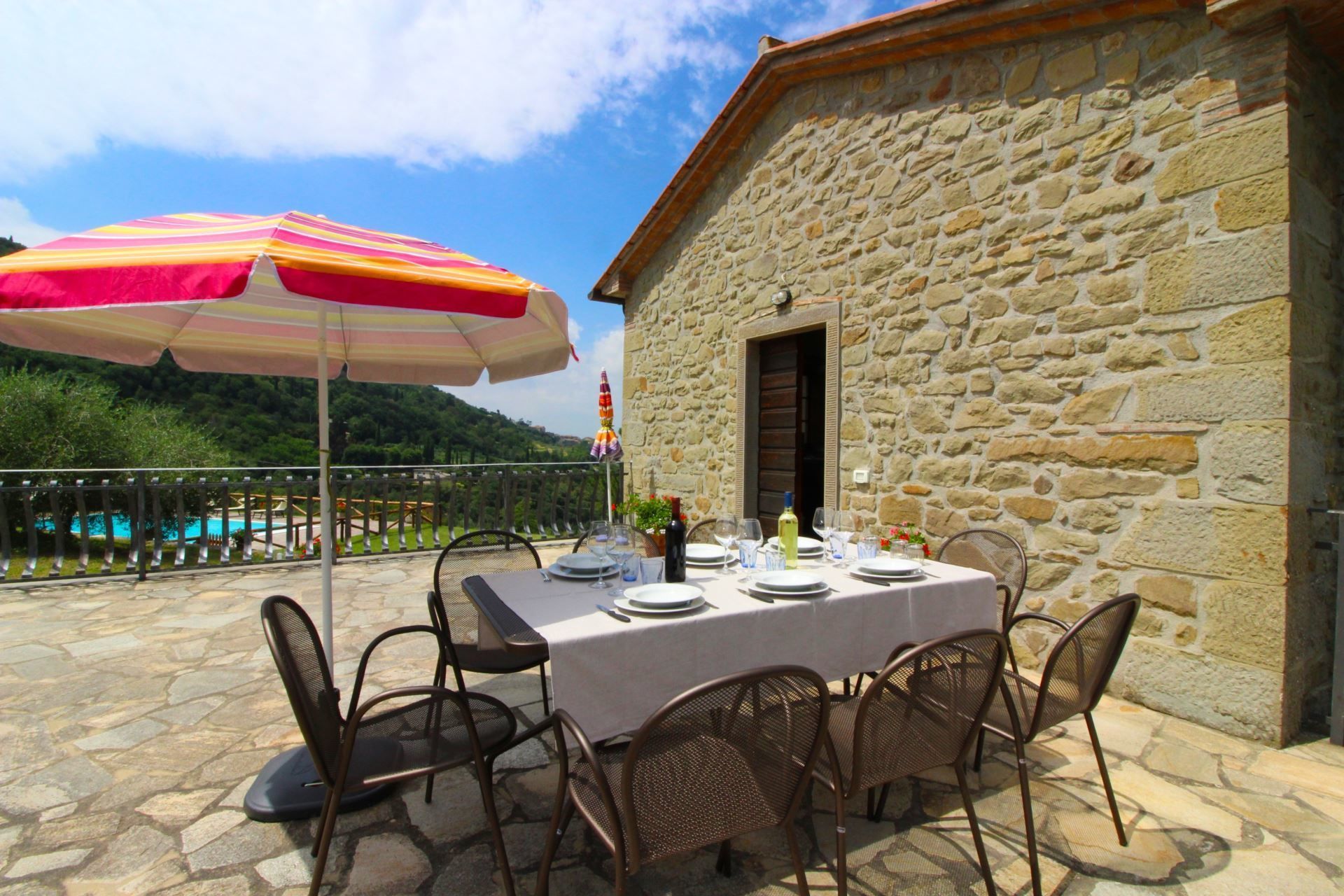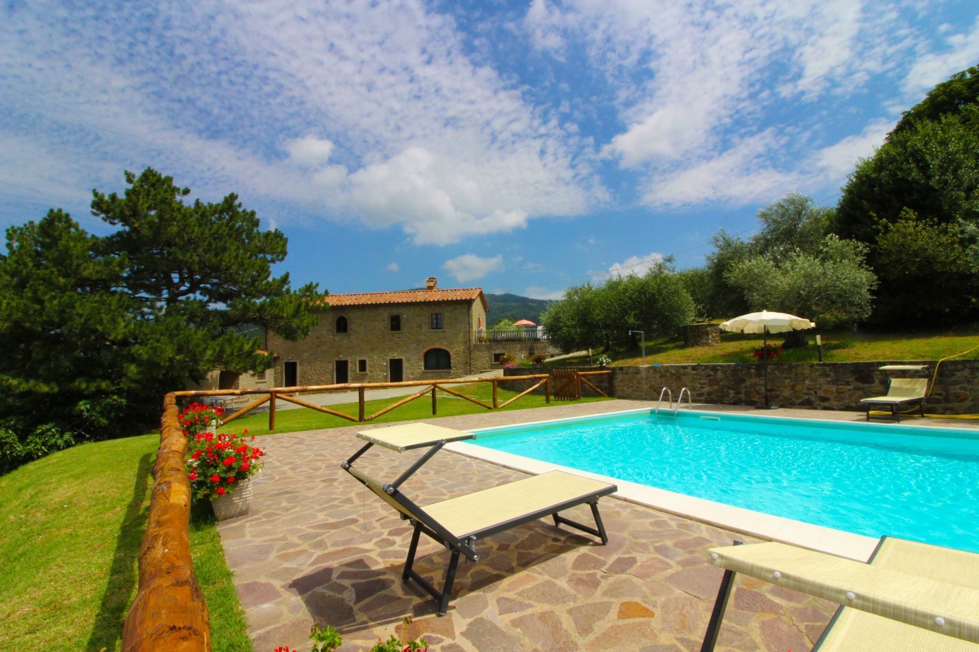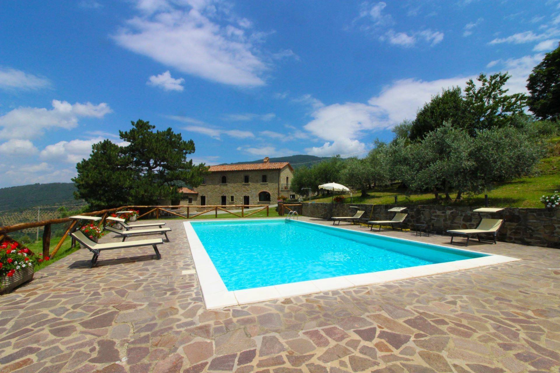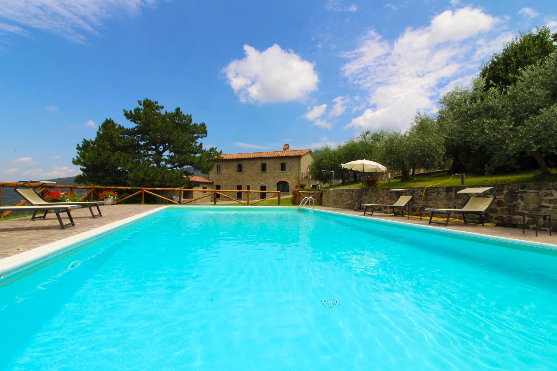 The villa, the swimming pool and the outdoor spaces. The holiday villa is situated on a hilltop, amidst terraced olive groves that stretch down into the valley. In front of the villa there is a large natural terrace, surrounded by olive trees and equipped with garden furniture, barbecue, wood-burning oven and a 6 x 12 m swimming pool (depth 1,20-1,50m). The villa is furnished in simple and tasteful Tuscan style.