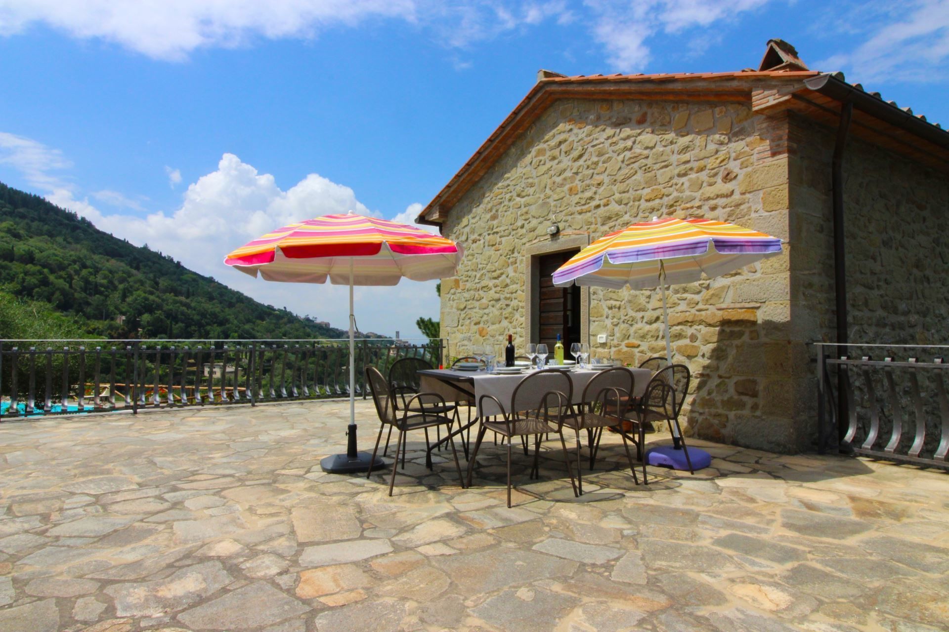 FIRST FLOOR: Access from the garden directly on the uphill side of the house. Large sun terrace equipped with table, chairs and umbrellas, kitchen/dining room with dishwasher, sitting room with double sofa bed and TV, two double bedrooms, bathroom with shower.