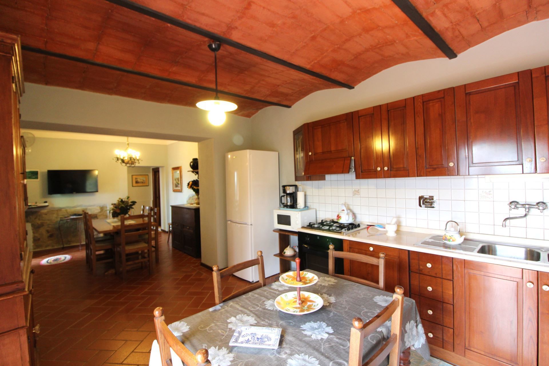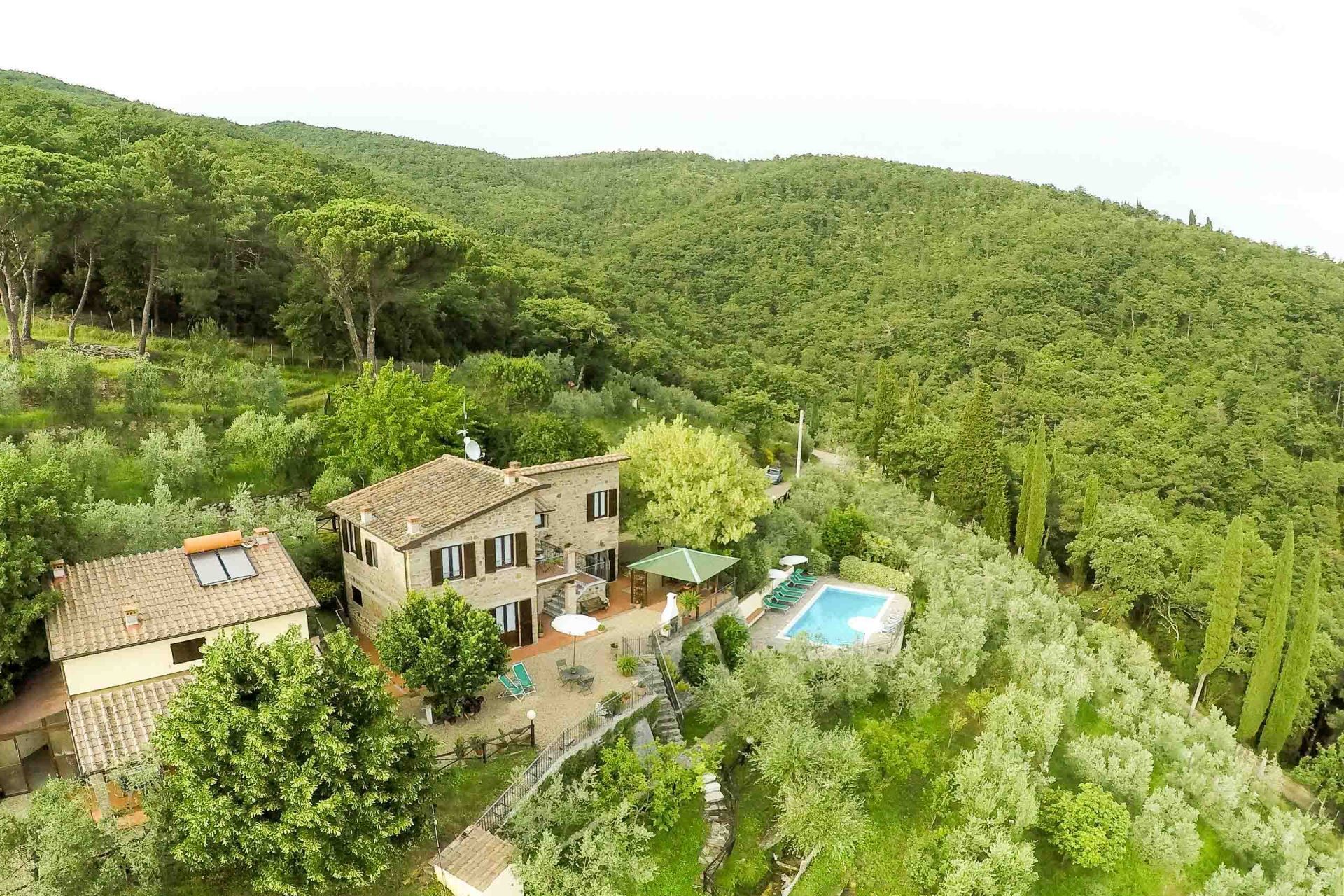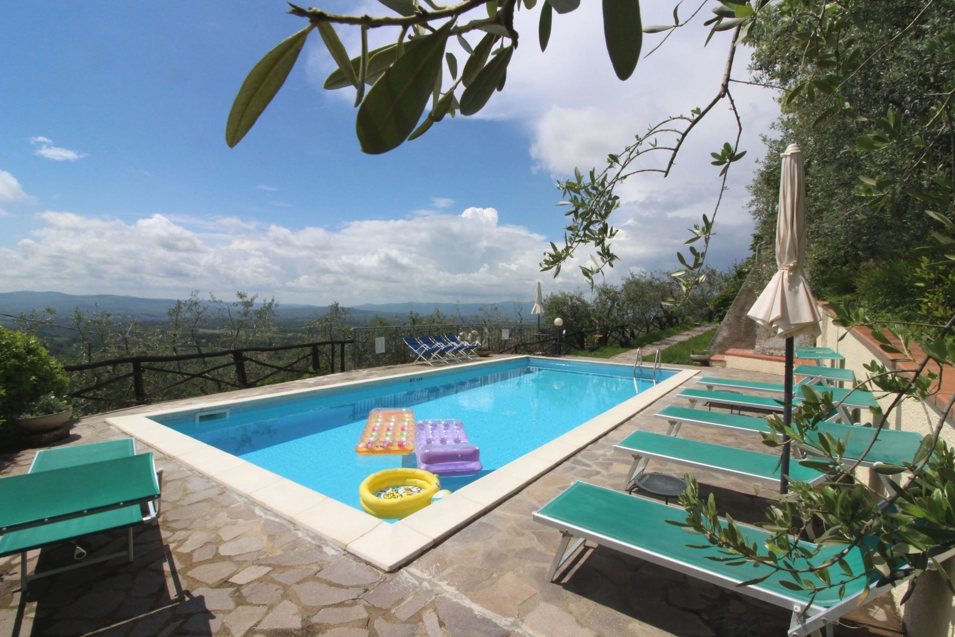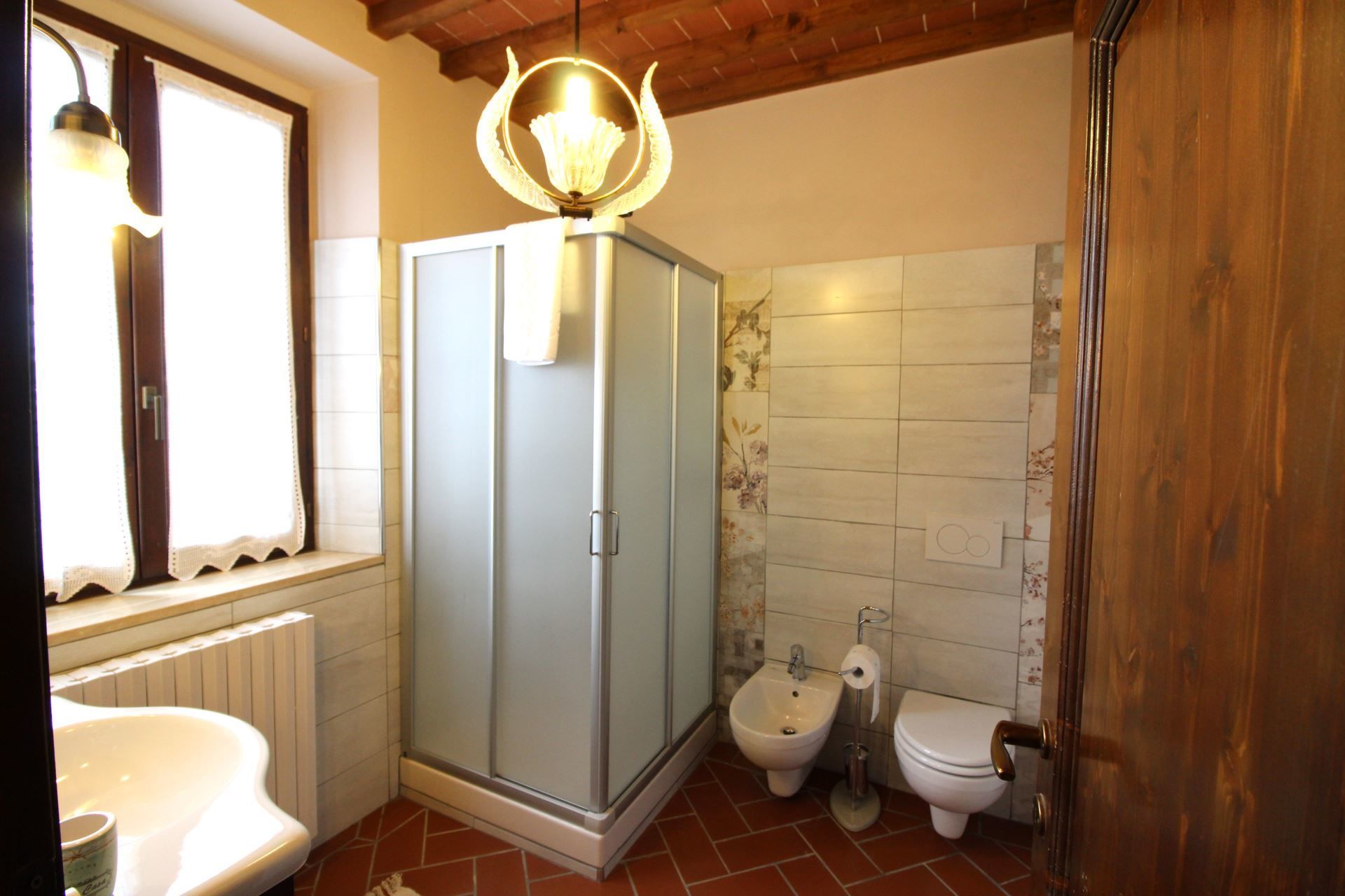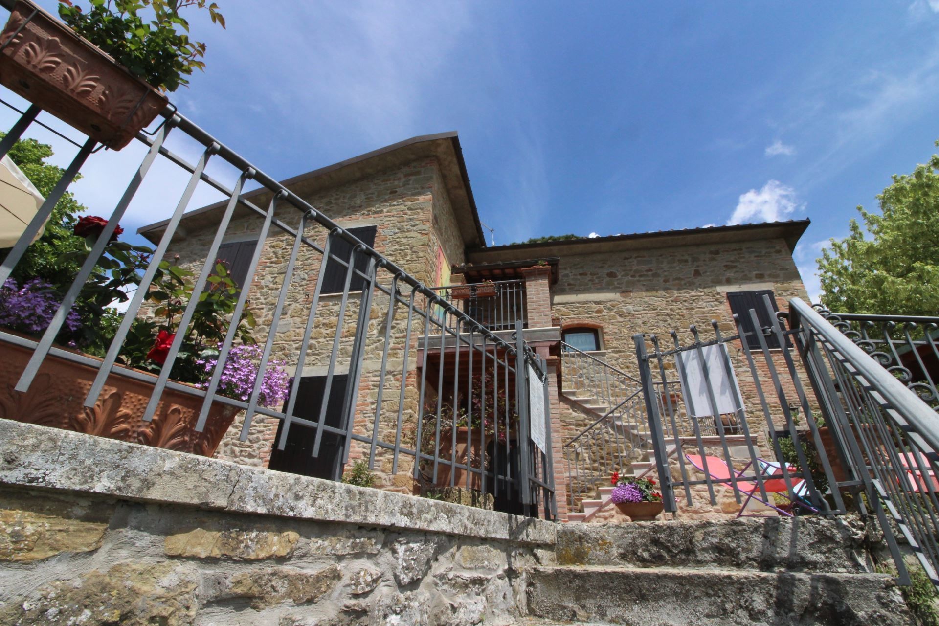 The house is located on the slopes of Pratomagno, which stands out from the Arno valley and descends with wide natural terraces full of olive trees, until the road of the “Setteponti”, connecting the cities of Arezzo and Florence. The village of San Giustino Valdarno with restaurants, bars and shops is about 1 km away and can be easily reached on foot with an enchanting walk through vineyards and olive grow.
