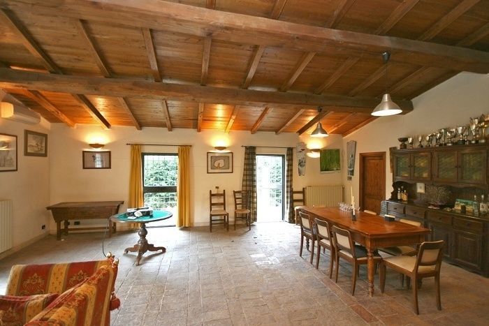 Ground floor: living-room (TV) with dining area and fireplace, kitchen, double bedroom, bathroom with bathtub.