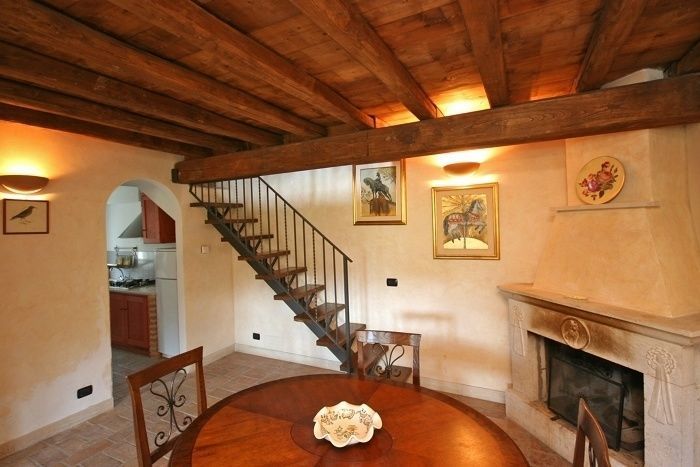 Ground floor: living-room (TV) with dining area and fireplace, kitchen, double bedroom, bathroom with bathtub.