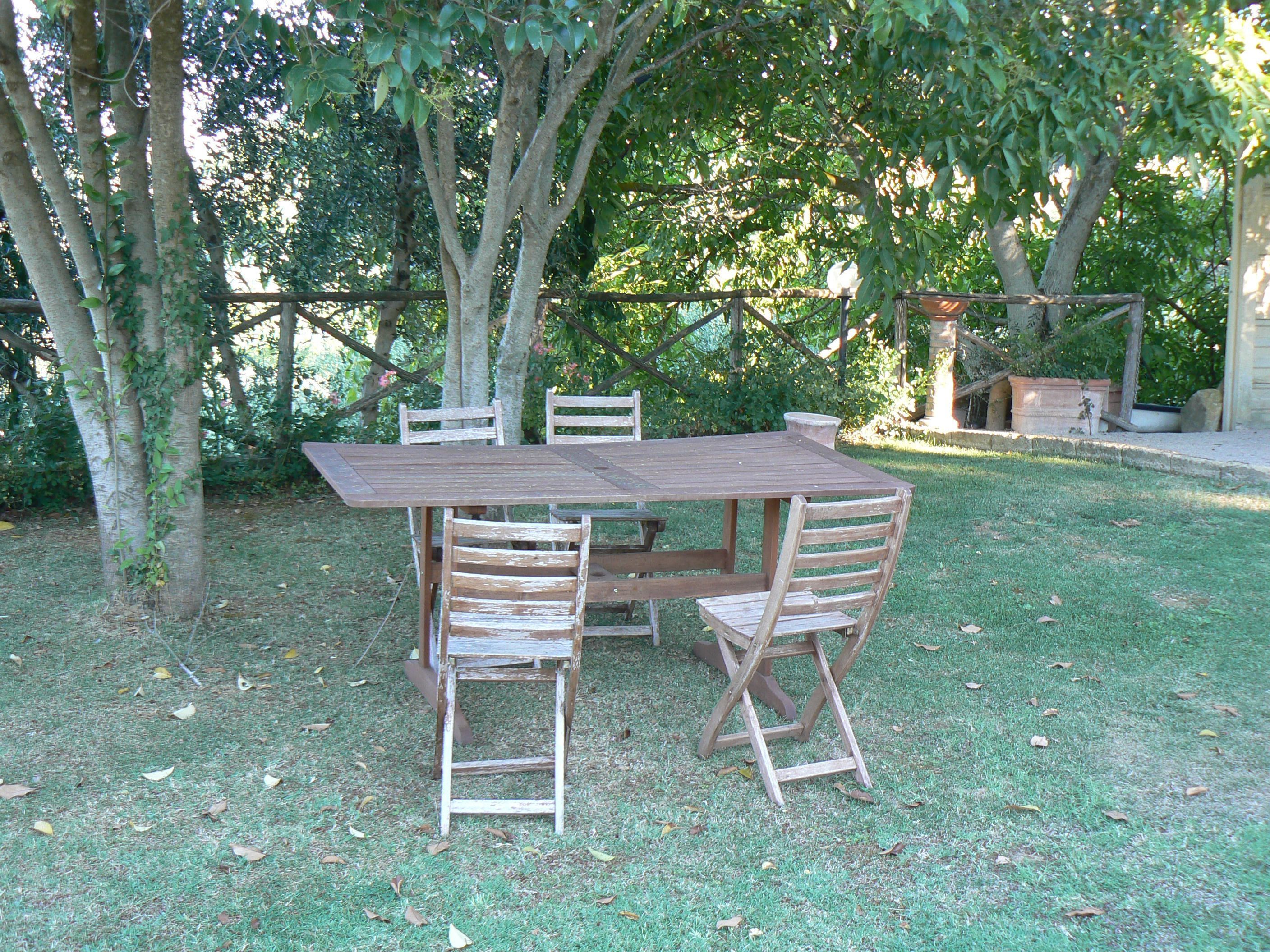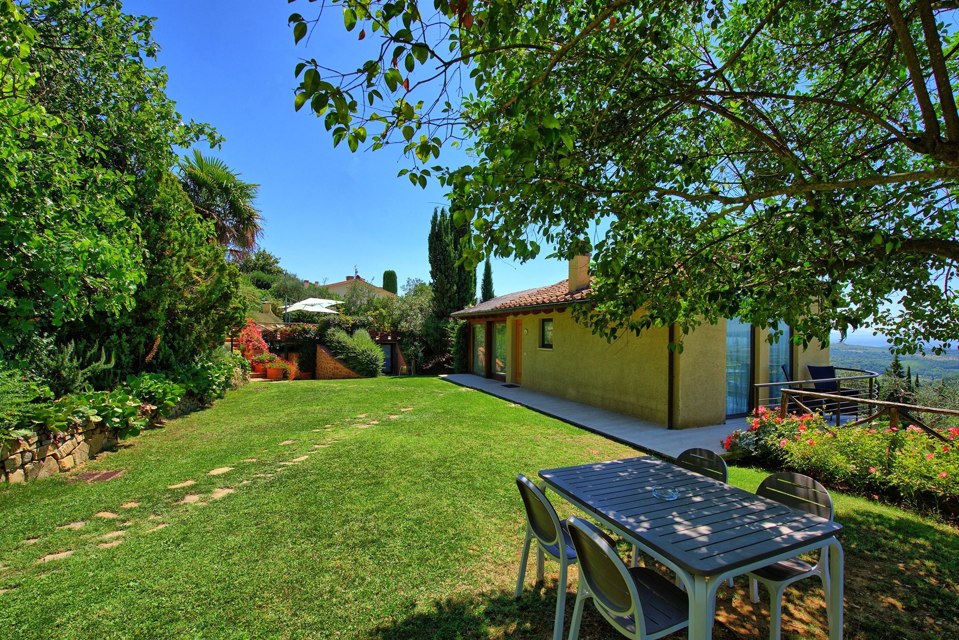 This beautiful house sits on a large estate (10.000 square meters) with olive groves and vineyards. The pool is approx. 20 m from the house away and it is to be shared with the owners. The house provides a nice, well-kept private garden.