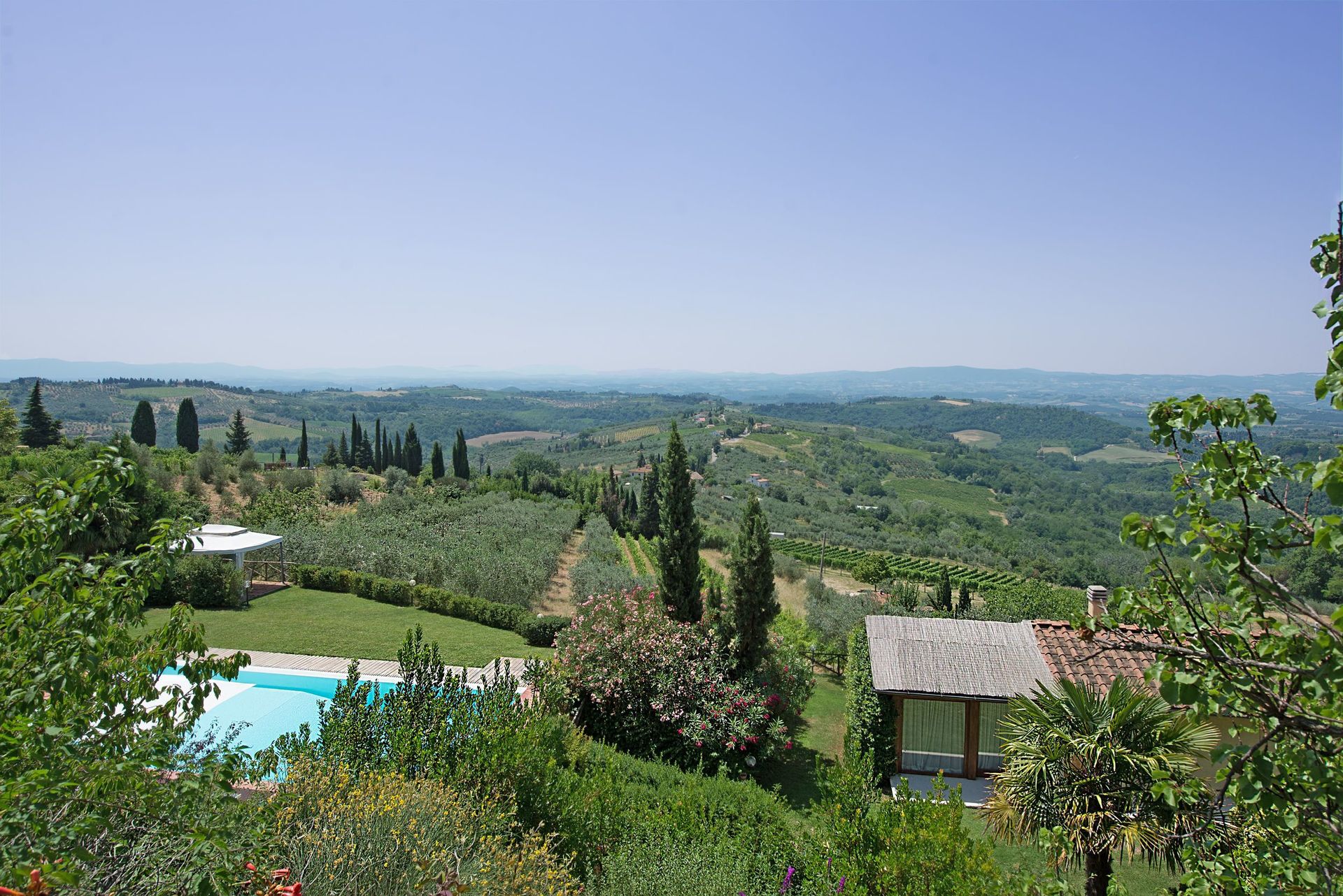 Distances: Tavarnelle with general stores 2 km away, San Gimignano 20 km, Florence (airport) 33 km away, Siena 39 km, Pisa (airport) 95 km, Lucca 105 km away.