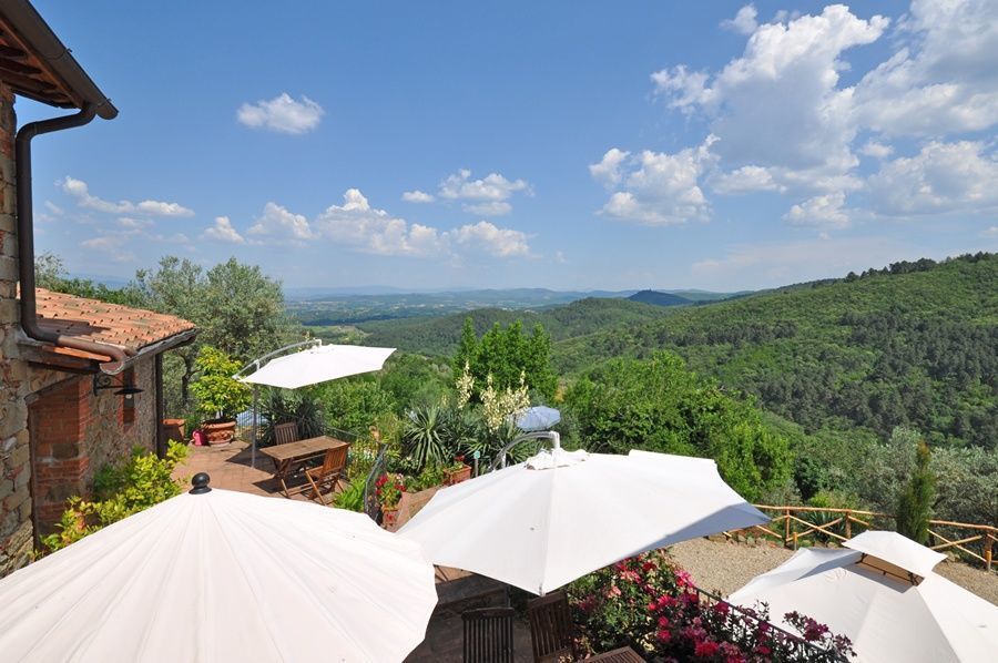 Panoramic flat with a view over the Arno valley, the Chianti Mountains and Moncioni. Olivaio is located on the first floor and accessible through external stairs. Living room with dining/kitchen corner and double sofa bed, double bedroom (matrass 180 x 200 cm), bathroom with shower. Panoramic terrace.
