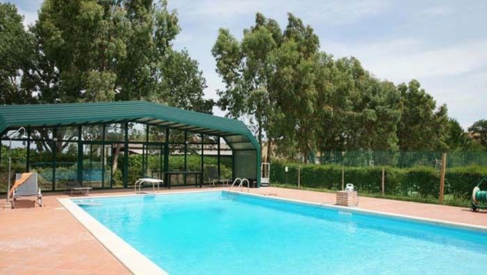 Fenced swimming Pool (NOT HEATED) (mt 12x6) with telescopic pool enclosure to use the pool in winter , equipped with one outdoor and one indoor shower, sun beds, tables, chairs and umbrellas.