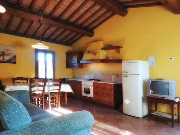Apartment Fiordaliso75 m². 4 persons. Situated on the first floor, private access via outside stairs, facing 3 sides of the central U-shaped stone house of the resort, has got typical tuscan furnishings, one large living/dining room with satellite tv and double sofa-bed and 1 extra single bed (bookable at an extra price), with full equipped kitchen (4 hotplates, oven, dishwasher, fridge), two bedrooms (one with a double bed and an added single bed, one with two twin beds), 1 bathroom with shower, bidet and wc, outdoor reserved gazebo, table and chairs. Independent heating.