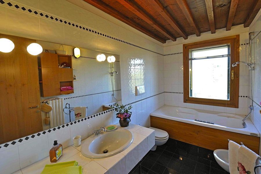 At guests’ disposal: large, well-kept garden with gazebo, sun-beds, sun-umbrellas, swing for children, private swimming-pool (18 x 8 m – min. depth 1,3 m – max. depth 2,5 m – open from 01/05 through 30/09) with small adjacent whirlpool (also suitable as a pool for children; not heated), changing room with showers and toilet, private tennis court (rackets and balls are provided). Guests can also enjoy use of a restored former barn providing kitchen, bread oven, barbecue and dining area ideal for al-fresco dining. WI-FI internet connection is available in the villa (free of charge). Laundry with washing-machine and ironing facilities.