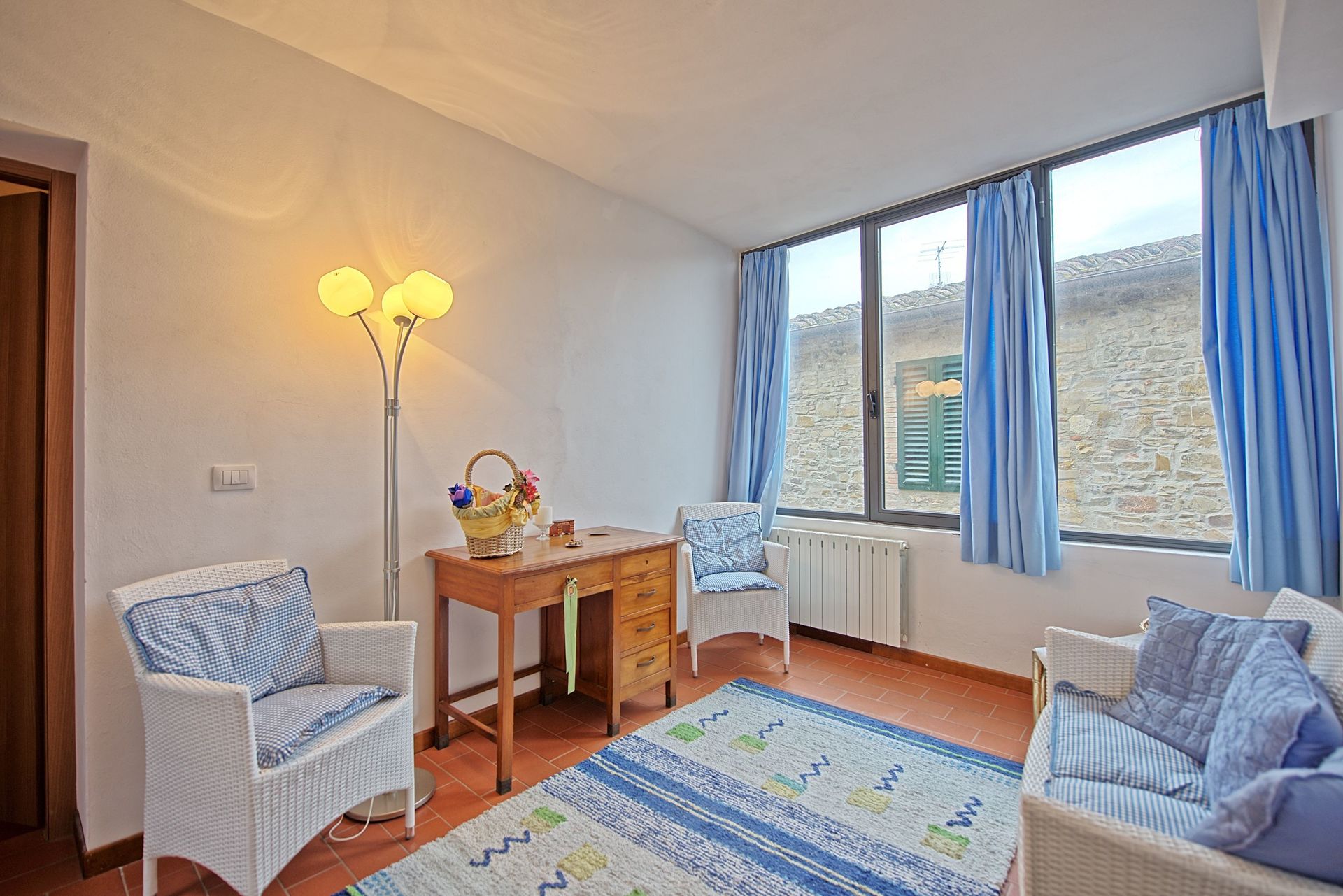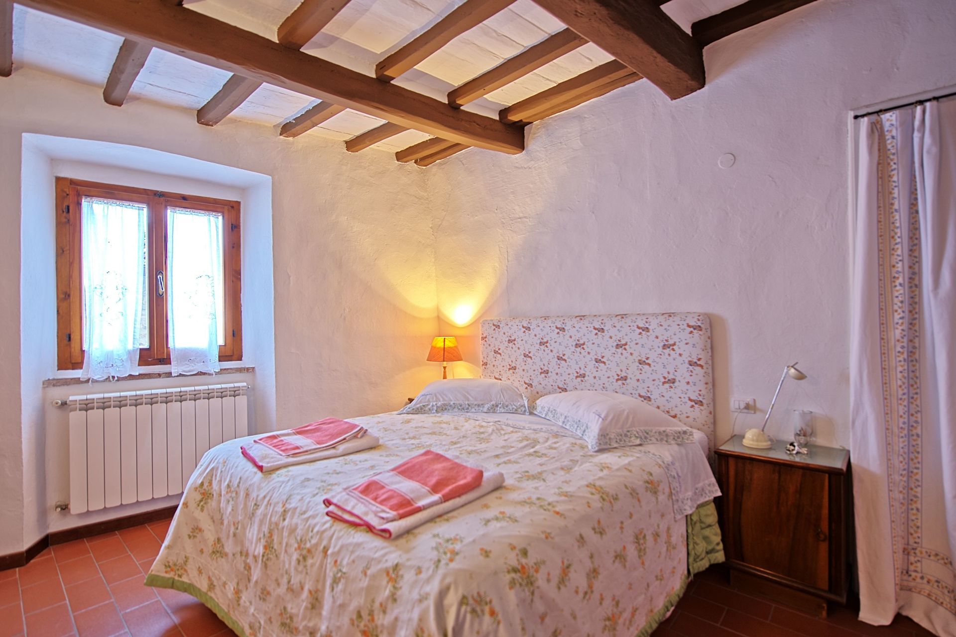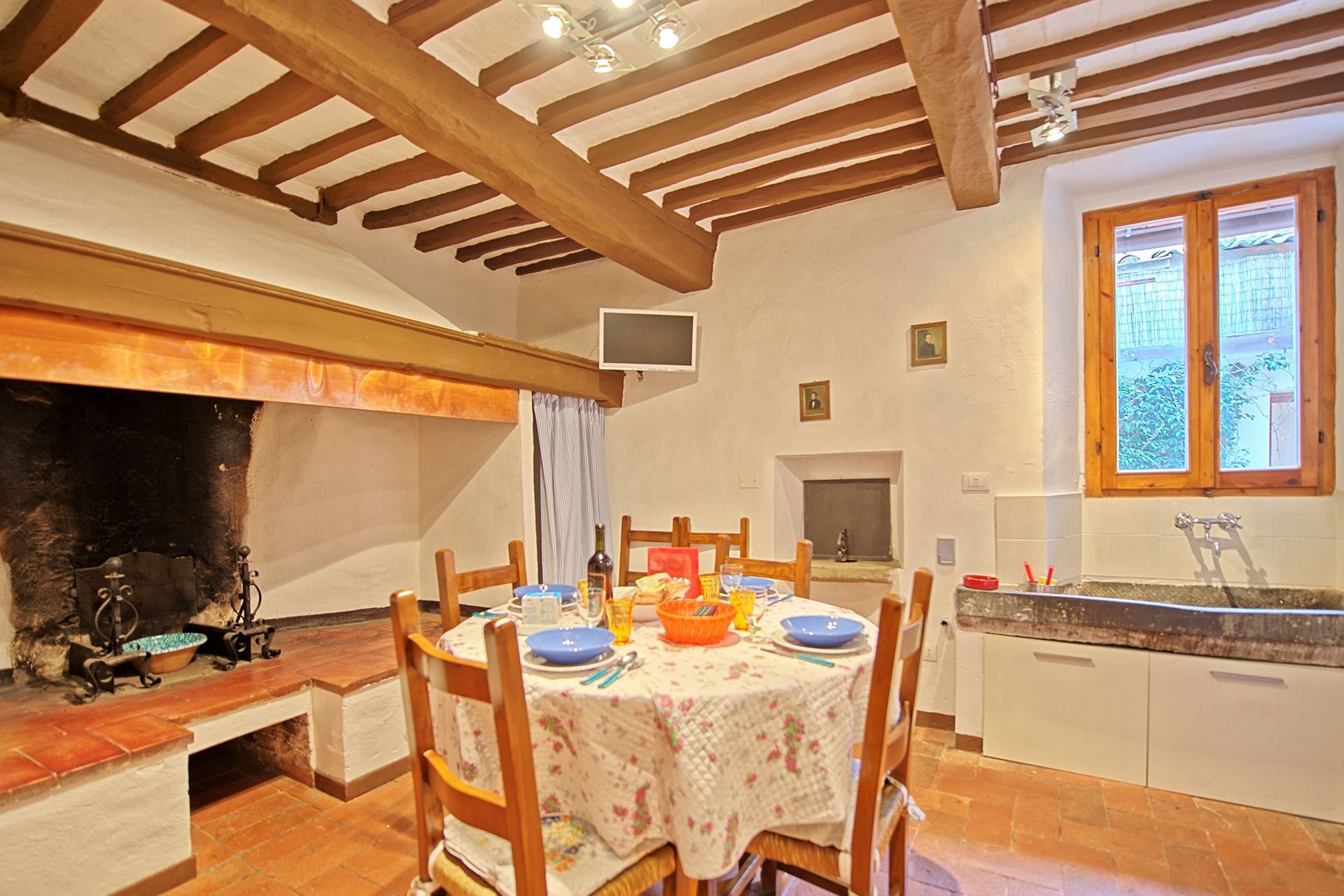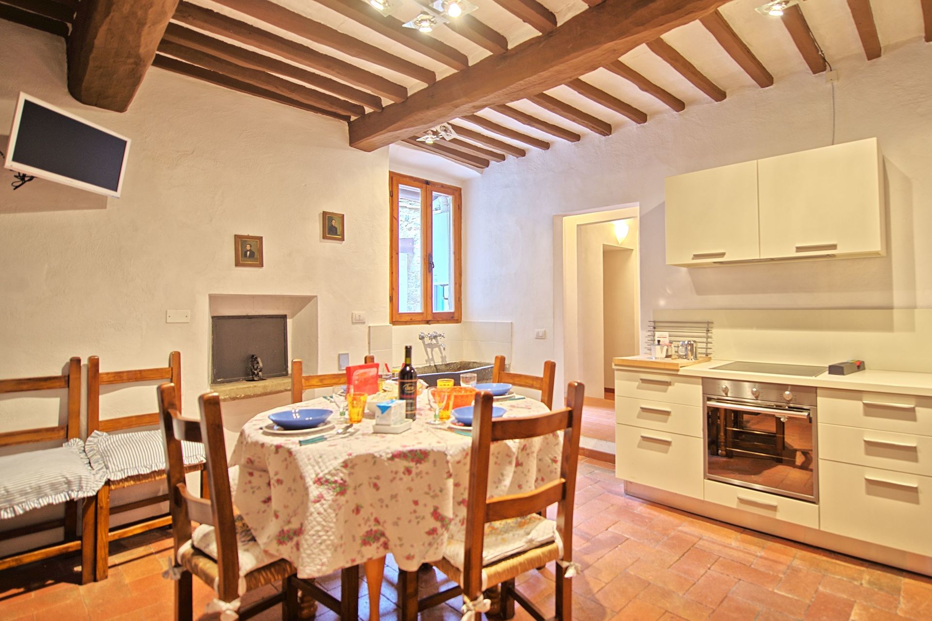 1st floor: dining area with large fireplace and kitchen corner (oven), double bedroom with ensuite bathroom with shower, living room with access on to a small private outdoor area (internal courtyard), twin-bedded room (convertible into a double bedroom) with ensuite bathroom with shower.