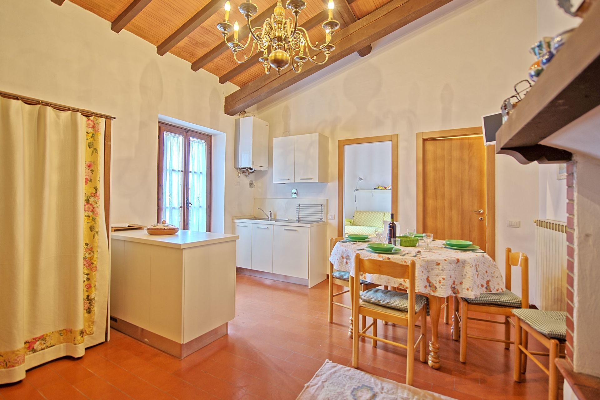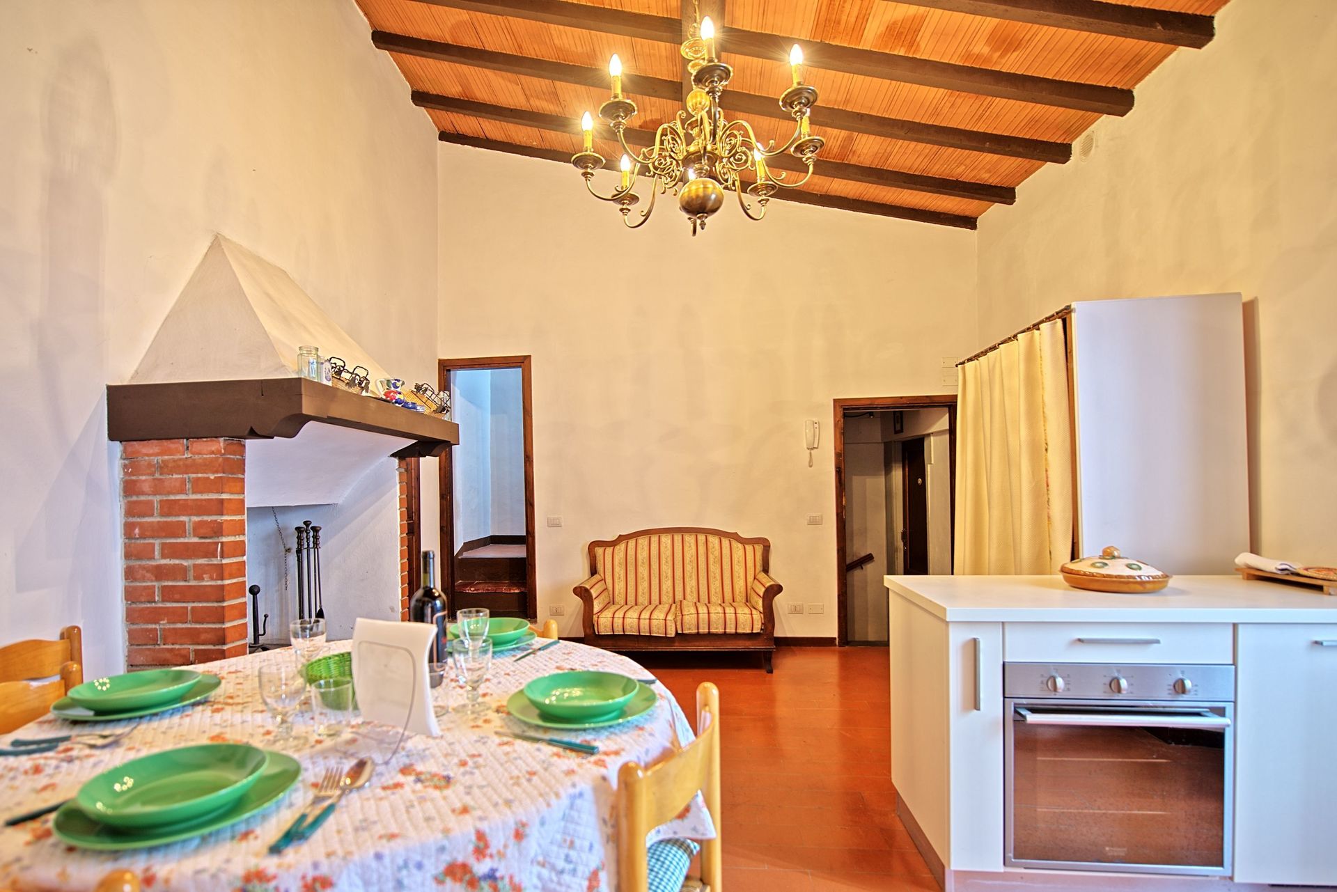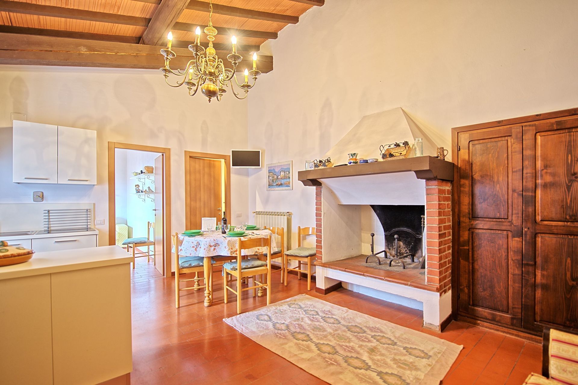 2nd floor: dining area with fireplace and kitchen corner (oven, dishwasher), bathroom with shower, living.-room with double sofa-bed and access on to a private, panoramic terrace with table and chairs.