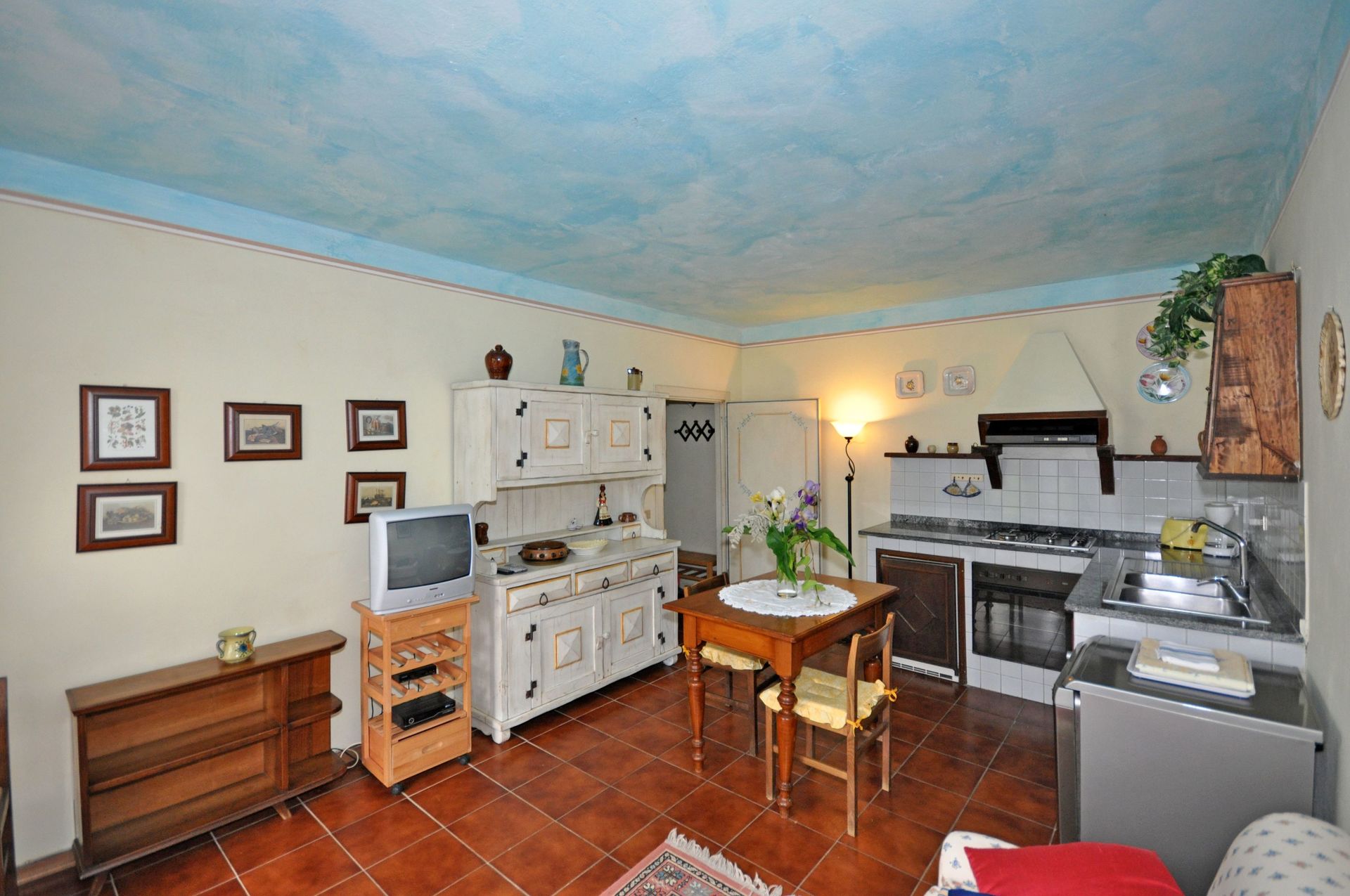 Ground floor: living-room with dining area and kitchen corner (oven, dishwasher), double bedroom, bathroom with shower.