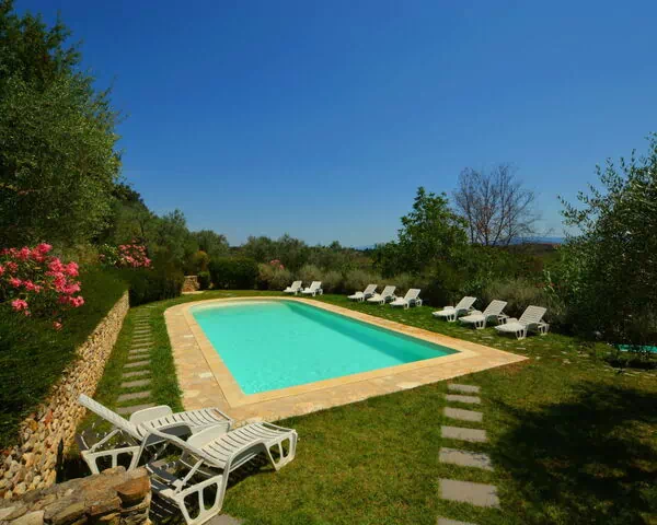 The outdoor spaces of "Casa delle Fiabe" are thoughtfully designed to invite relaxation and al fresco living in the heart of the Tuscan landscape. The private garden of 2,000 m2, while unfenced, offers an open and natural atmosphere adorned with a well-maintained lawn and colourful flowers that change with the seasons. The impressive 70 m2 swimming pool, featuring elegant Roman steps and an internal staircase, is the focal point of outdoor leisure and is open seasonally from 03 April to 16 October. An outdoor shower is conveniently located adjacent to the pool area, ensuring comfort and practicality for swimmers. The terrace is generously furnished with garden furniture and equipped with a barbecue, making it an ideal setting for outdoor dining, entertaining, and enjoying long summer evenings in the company of family and friends.