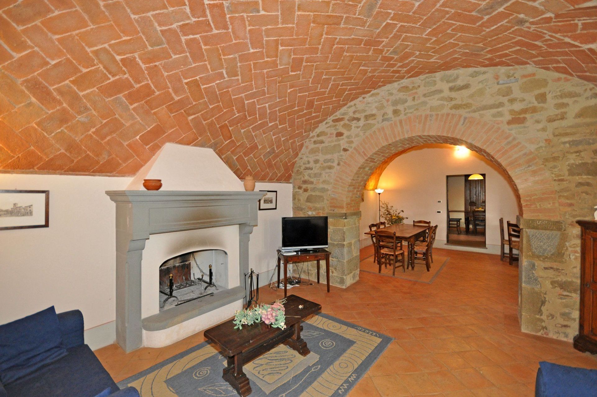 Ground floor: living-room (satellite TV) with fireplace and dining area.