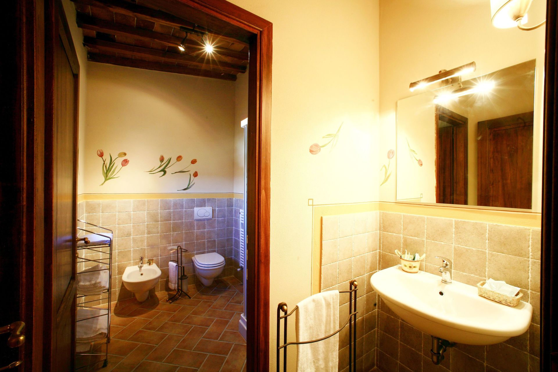 First floor 1 double bedroom with a large panoramic window on the garden, a bedroom with two twin beds (convertible into double) and a bathroom with a shower.