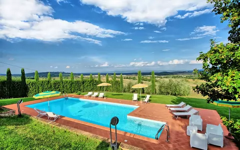 Beautiful stone farmhouse recently restored situated in panoramic location with views over the valley of Casole D’Elsa, an ancient medieval and very well-preserved town. This villa is surrounded by a beautiful and well-kept garden sloping down to the swimming-pool. The owners live in front of the villa but do not use the pool or the garden. The house offers nice interiors furnished in a Tuscan style.