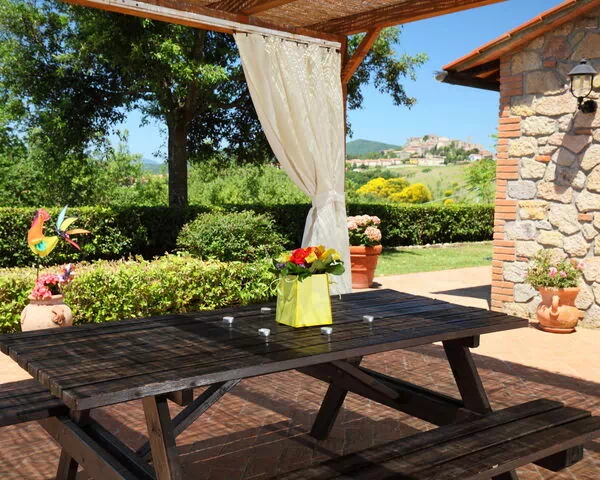 "Poggiolo" is equipped with a comprehensive range of amenities designed to enhance your stay. Air conditioning is available in both the living area and the 2 bedrooms, ensuring a pleasant indoor climate throughout your visit. The kitchenette is well appointed with a dishwasher and microwave, alongside an oven, toaster, and electric coffee machine, making meal preparation both convenient and enjoyable. Entertainment is catered for with a satellite TV and an additional television in the living space. A washing machine is available for your use during your stay. The private patio and garden area features a barbecue and a dedicated sitting area, offering a perfect setting for outdoor dining while taking in the panoramic views of the surrounding countryside and Roccastrada. Free WiFi is also provided throughout the property.