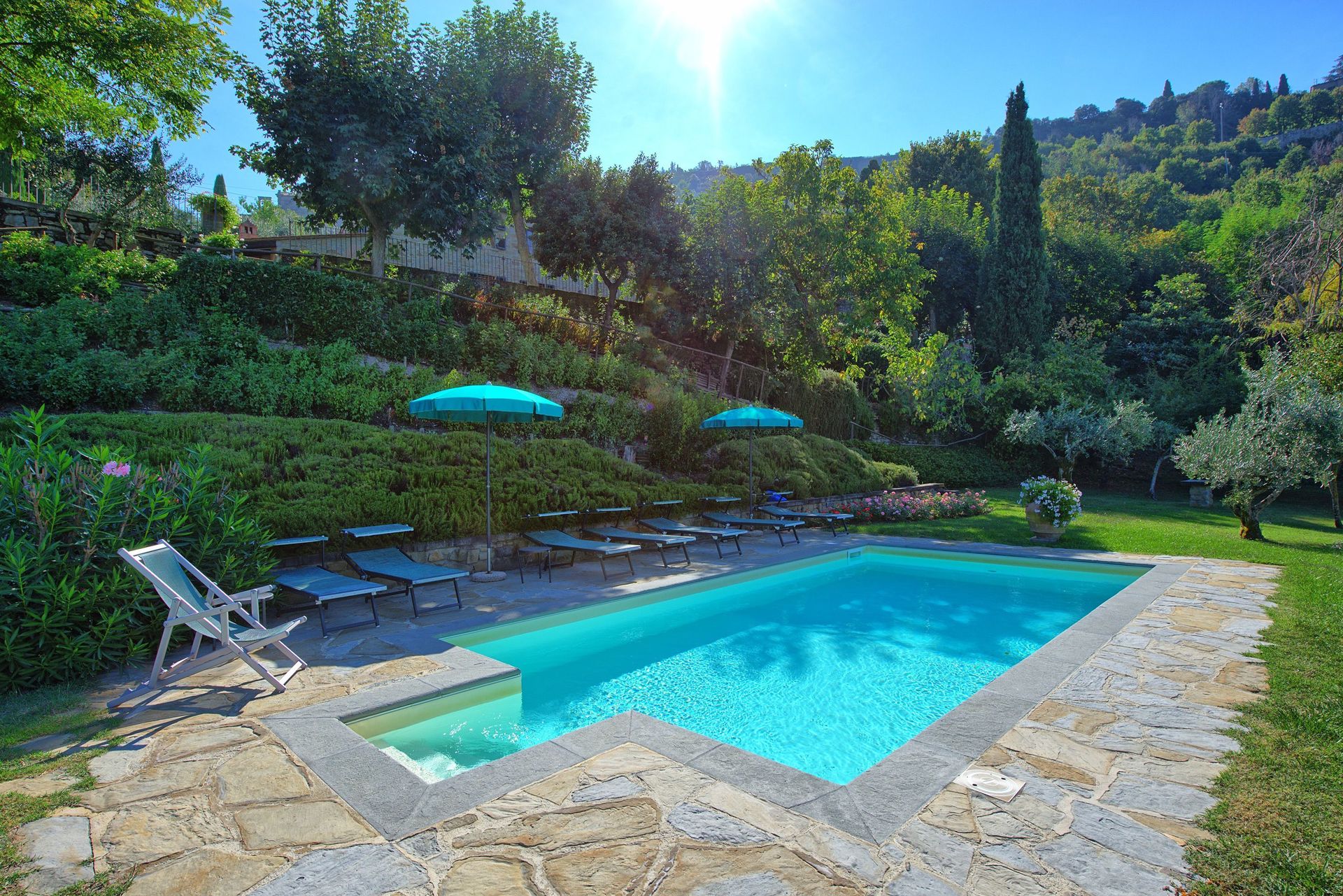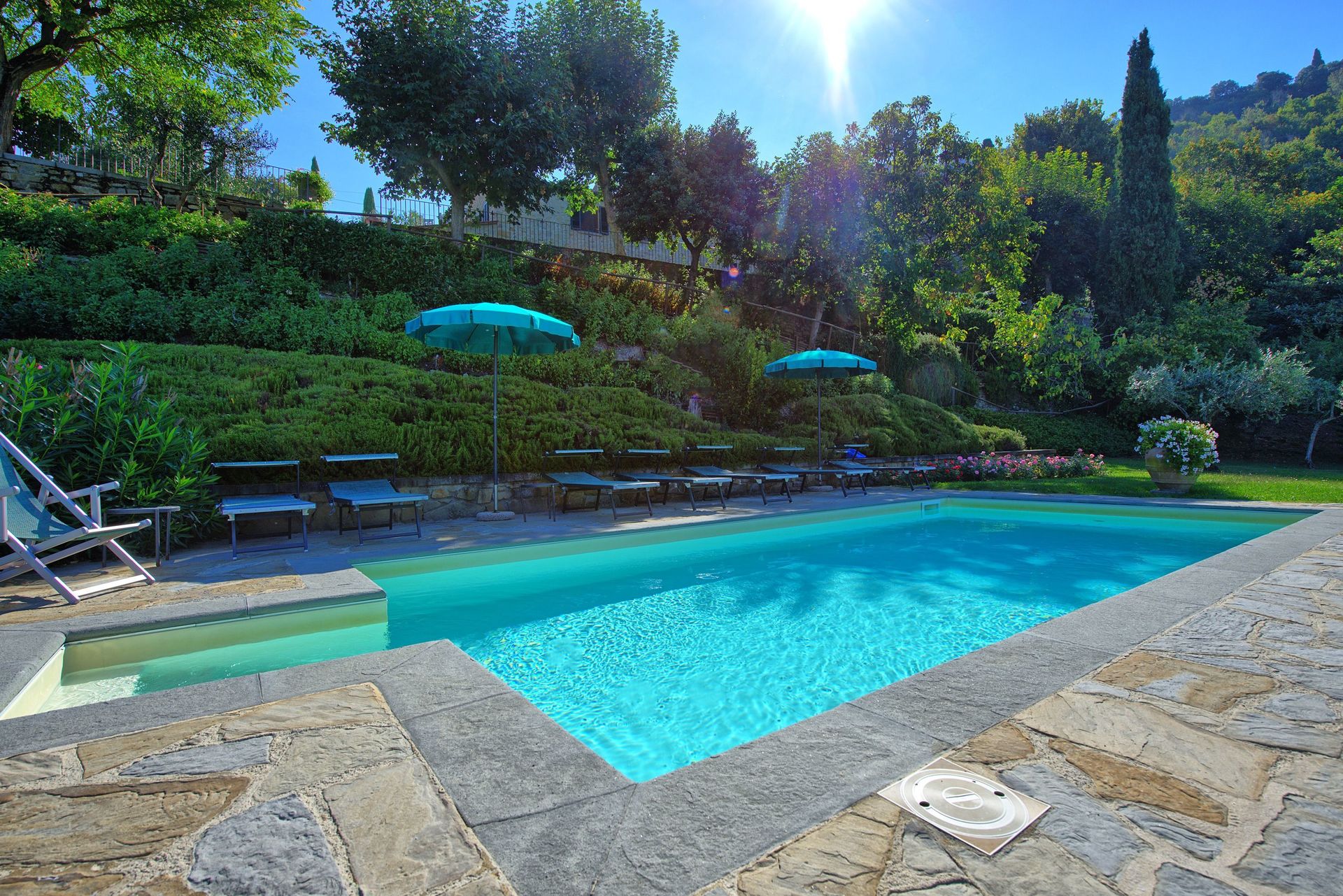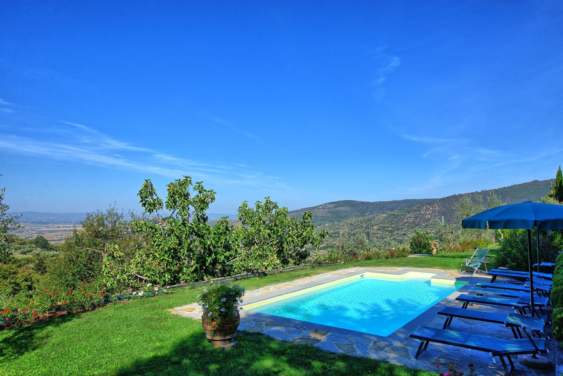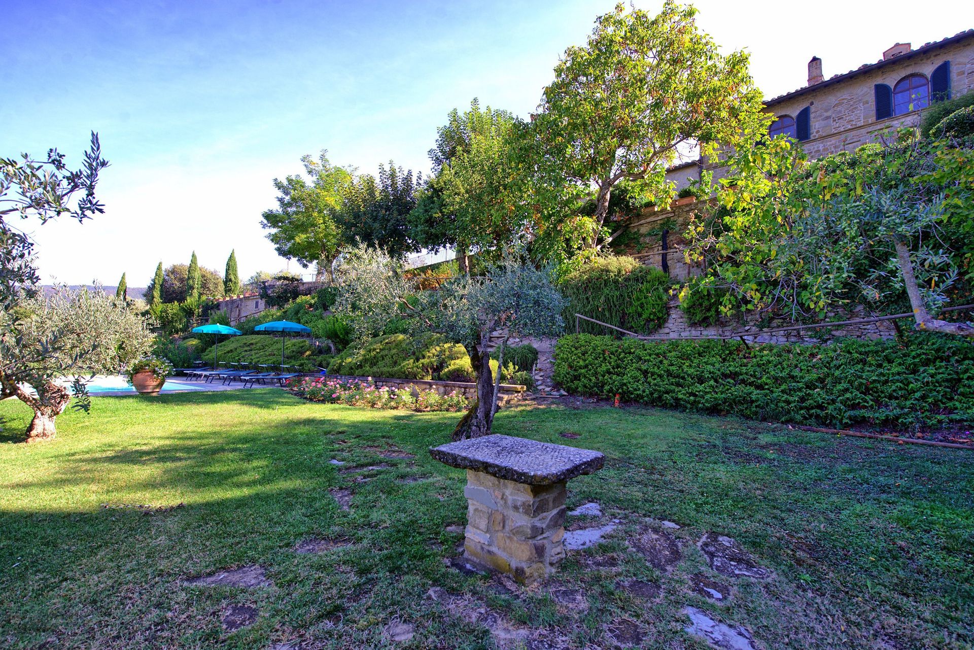 Both the villa and the farmhouse open out through large French doors (all with insect screen) onto the front garden unfolding with terracings and lawns.