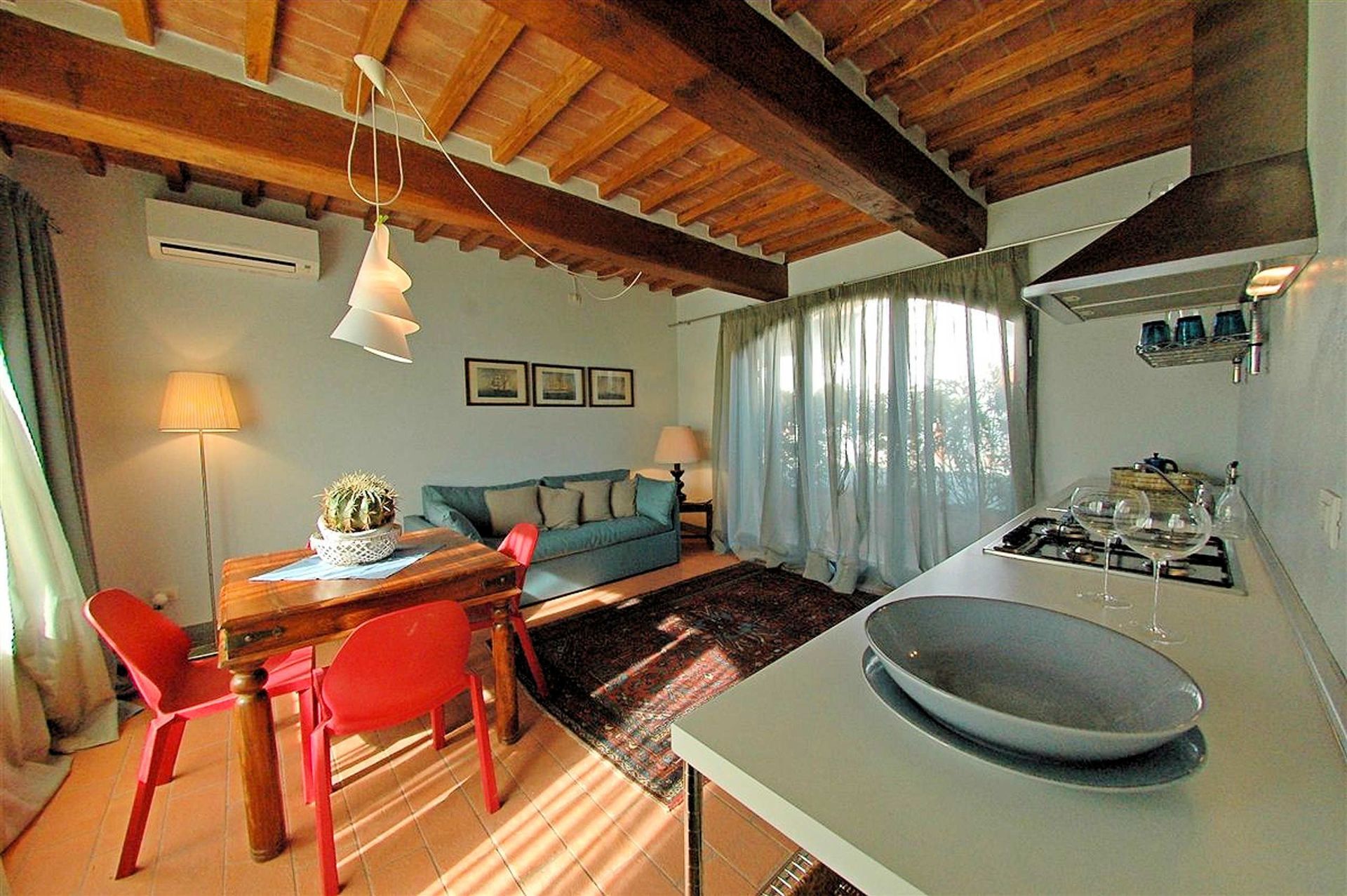 This apartment has a private, covered veranda equipped with a table and chairs. It has a small entrance which leads into a sitting room with a kitchenette, one double bedroom and a fully furnished bathroom including a hairdryer. The house has all the modern comforts including heating, air conditioning and a TV.