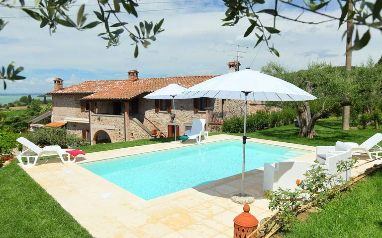 Nestled in the serene Umbrian countryside of Magione, Italy, this charming holiday rental is a beautifully preserved early 1900s residence known as "Trasimeno link," offering an authentic and tranquil retreat just steps from the shores of Lake Trasimeno. Set in a sunny, peaceful cul-de-sac approximately 450 metres from the lake, this semi-detached 2-family house combines historic character with modern comforts, making it an ideal base for exploring one of central Italy's most captivating landscapes. The property is surrounded by a lush natural garden of 350 square metres, where centuries-old olive trees frame breathtaking views of the lake, creating an atmosphere of timeless serenity. A private swimming pool measuring 4 x 6 metres with a depth of 135 cm is available seasonally from 1 May to 14 October, immersed in greenery and offering a wonderfully peaceful setting for relaxation. Wireless internet access is available throughout the property, ensuring you remain connected during your stay. Convenient private parking for 2 cars is provided directly at the house, and the generous yard surrounding the residence enhances the sense of space, privacy, and natural beauty that defines this exceptional retreat.